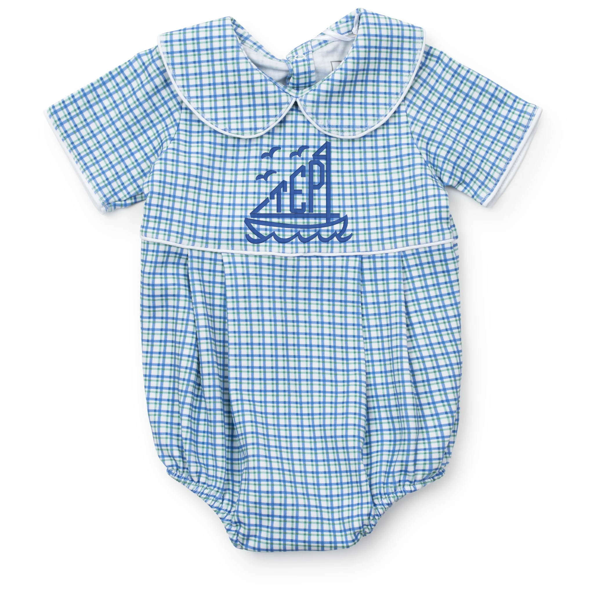 Boys' peter pan collar short sleeve pima bubble. Contrast piping on collar, sleeve and waist. Button closure in back and three snaps in the stride. Made from 100% Peruvian Cotton.