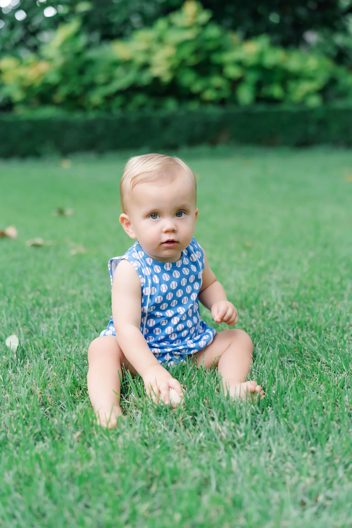 Boys' sleeveless pima cotton bubble. Contrast piping on down the front. Button closure in back and three snaps in the stride. Legs have elastic. Made from 100% Peruvian Cotton.