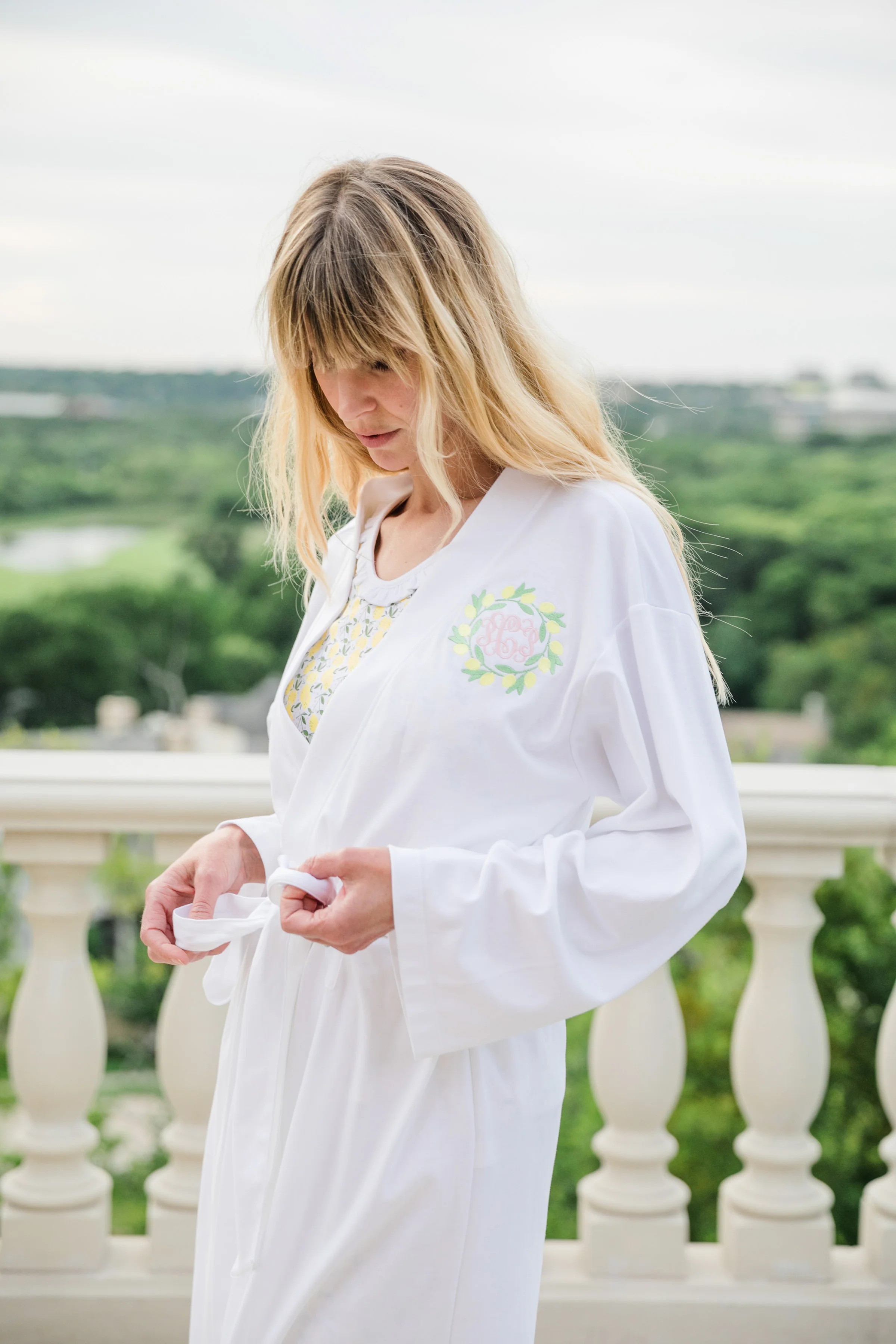 A women’s Pima cotton spa wrap designed with a soft, comfortable fit, featuring a sewn‑in back tie and discreet side pockets for ease and functionality. Made from 100%