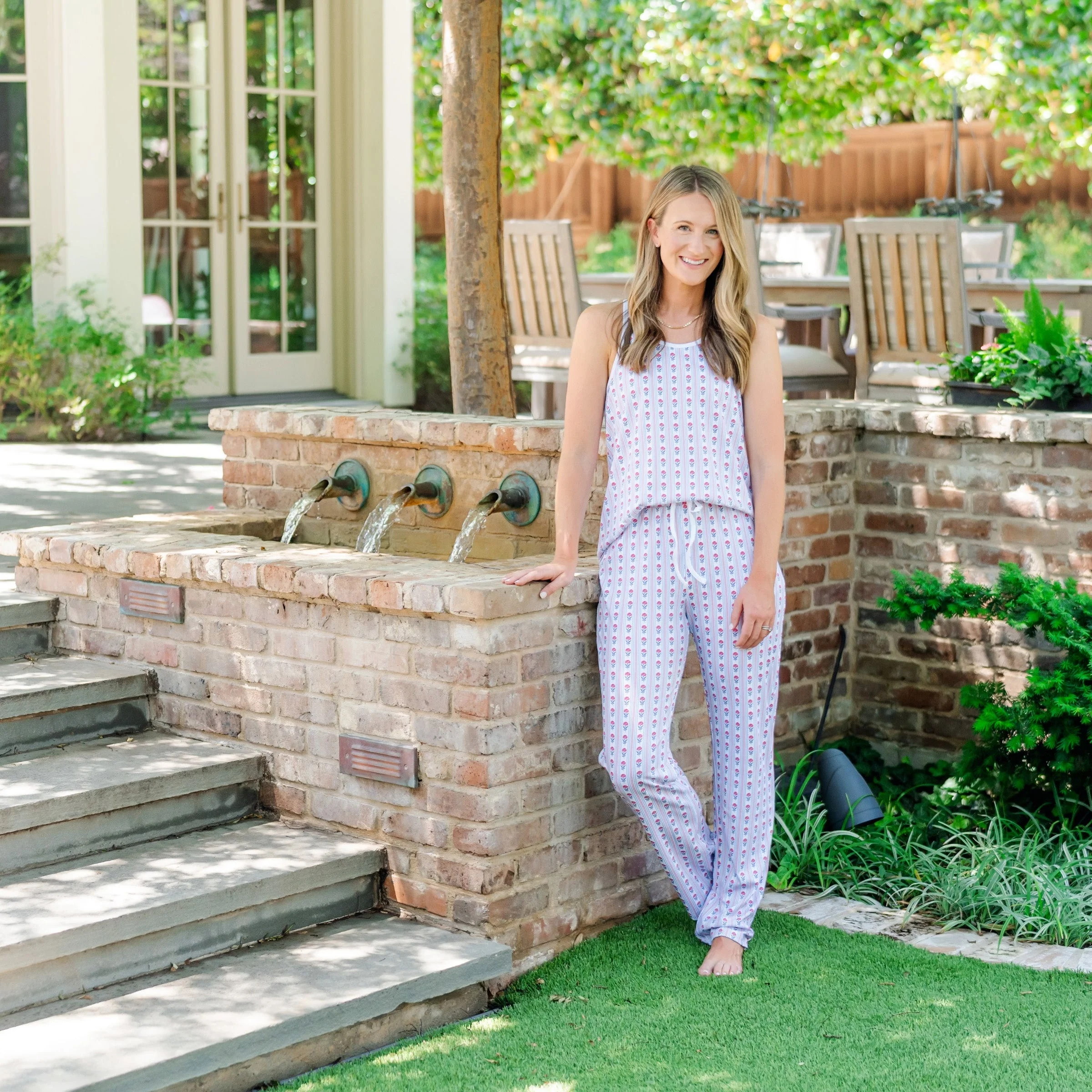 A women’s sleeveless Pima cotton pajama set featuring a racerback top and coordinating lounge pants with a comfortable drawstring waistband. Made from 100% Peruvian Pima cotton for a soft, breathable feel.